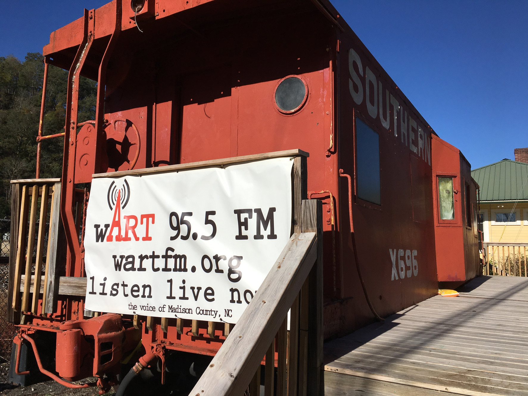 A low-power FM community radio station broadcasting a variety format from Marshall, North Carolina, in the Madison County area. Originally operating from a distinctive broadcast location inside a historic red caboose situated in the downtown corridor, the station's physical infrastructure was severely damaged on September 27, 2024, when the French Broad River rose approximately twenty-six feet during historic flooding, displacing the caboose roughly three hundred feet downstream. Following the disaster, the station relocated to a temporary home and continued operations, maintaining its live streaming service throughout the recovery period. Programming is accessible online at any time, and the station is involved with local recovery and community organizations including CHC and Reclaim Madison.